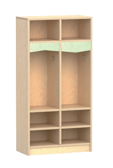 Available in 2 or 4-bay configurations with upper shelves, central hooks with privacy flaps, and lower cubbies, this compact design fits neatly into entryways, cloakrooms, or classroom corners, maximizing floor space while giving each child a dedicated spot. Ideal for Montessori, Reggio-inspired, or traditional preschool settings.